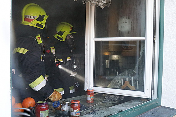 Aus noch unbekannter Ursache war in einem zweistöckigen Wohnhaus in der ebenerdig gelegenen Küche, im Bereich des Herdes, ein Brand ausgebrochen. Ein Atemschutztrupp konnte den Brand durch Vornahme einer Löschleitung zwar rasch unter Kontrolle bringen und ablöschen, allerdings musste eine Frau von der Rettung mit dem Verdacht auf Rauchgasvergiftung ins Krankenhaus gebracht werden. Obwohl die Zufahrt durch parkende PKW erschwert war, erreichten die ersten beiden Fahrzeuge den Einsatzort sechs Minuten nach der Alarmierung.