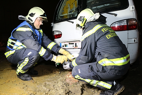 Eine sehr zeit- und arbeitsaufwendige Fahrzeugbergung musste die Einsatzmannschaft der Freiwilligen Feuerwehr Maria Enzersdorf am 7. Jänner 2018 bewältigen. Am Sonntagabend, genau um 18:00 Uhr, erfolgte die Alarmierung zur Hilfeleistung, aufgrund eines steckengebliebenen Transporters, am Areal einer neuen Wohnhausanlage in der Hauptstraße. Der betroffene Lenker wählte, zwecks einer Anlieferung, den noch unbefestigten Weg entlang der Wohngebäude und blieb beim anschließenden Wendeversuch am Umkehrplatz im tiefen Erdreich stecken. An der Einsatzadresse angekommen, erfolgte die gemeinsame Erkundung durch den Einsatzleiter und den Maschinisten des schweren Rüstfahrzeuges. Man wusste, dass die Zufahrtsbreite für das benötigte Einsatzfahrzeug zwar nur um Haaresbreiten ausreicht, entwickelte aber dennoch einen funktionierenden Plan, um die Bergung mittels Seilwinde zu ermöglichen. Stück für Stück und unter vollster Konzentration des erfahrenen Einsatzmaschinisten, konnte das schwere Rüstfahrzeug in Stellung gebracht und das Windenseil am Transporter angeschlagen werden. Kurzerhand war der eingesunkene Kleinbus aus dem Schlamm gezogen. Um allerdings den langen und sehr engen Weg zurück auf befestigten Untergrund unbeschädigt zu überwinden, musste das Fahrzeug auf ständigem Zug der Seilwinde geführt werden. Dazu waren weitere Hilfsmaßnahmen am Untergrund nötig. So wurden, zum Ausgleich tiefer Unebenheiten, Holzkonstruktionen verlegt, sodass weder das Einsatzfahrzeug, noch der Transporter gegen eine der beidseitigen Wände abrutschen konnte. Nach diesen aufwendigen Tätigkeiten folgten direkt an der Einsatzstelle die erforderlichen Reinigungsarbeiten an sämtlichen Gerätschaften, für die Mannschaft, aber auch an dem stark verschmutzen, geborgenen Fahrzeug. Dazu wurde eine Schnellangriffseinrichtung eines Tanklöschfahrzeuges eingesetzt, um die Räder, die Radkästen und auch den Unterboden abzuwaschen, damit der Lenker seine Fahrt im Straßenverkehr fortsetzen kann. Nach rund 2,5 Stunden waren alle Arbeiten erledigt und die 18 Mitglieder der Freiwilligen Feuerwehr Maria Enzersdorf konnten, mit deren fünf Fahrzeugen, wieder ins Feuerwehrhaus einrücken.