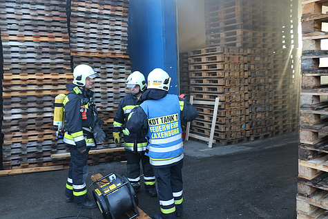 Die stark verrauchte Lagerhalle wurde mit einem Überdruckbelüfter vom Rauch befreit.