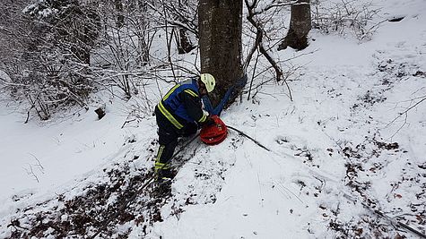 Unmittelbar nach dem Eintreffen entschied der Einsatzleiter, den verunfallten Sattelzug mittels Seilwinde von KRAN Mödling und einmaligem Umlenken über einen Baum aus seiner misslichen Lage zu befreien. Auf Anhieb konnte der gewünschte Erfolg erzielt und der verunfallte LKW wieder zurück auf die Fahrbahn gebracht werden.