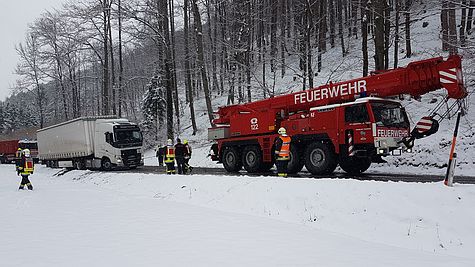 In den Vormittagsstunden des 20. Februar 2018 wurde die Kran-Gruppe der Stadtfeuerwehr Mödling zu einer Lkw-Bergung nach Pottenstein alarmiert. Eine Zugmaschine samt Sattelauflieger kam offensichtlich aufgrund der widrigen Witterungsbedingungen von der Fahrbahn ab, und landete im Straßengraben.