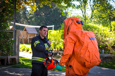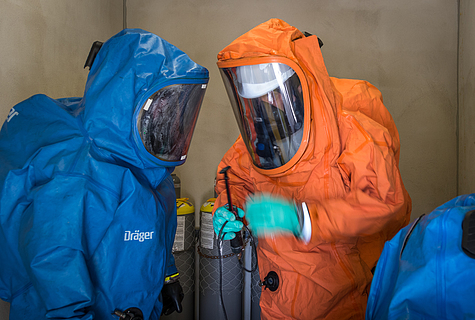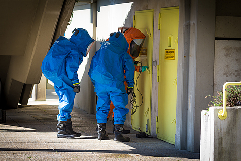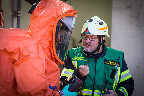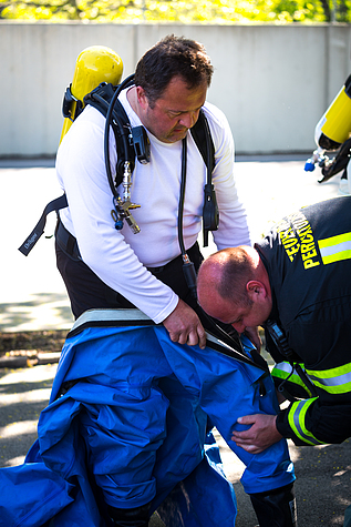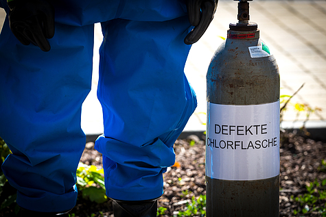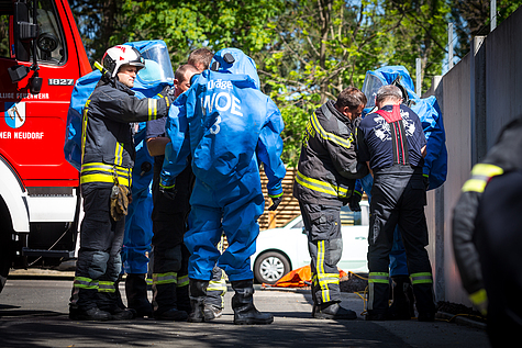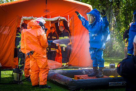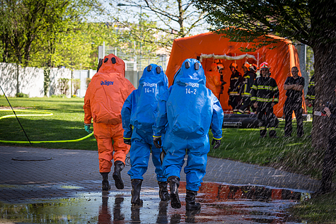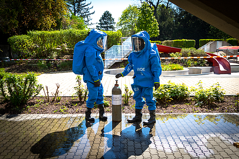 Für alle weiteren Tätigkeiten, müssen die Feuerwehrleute gasdichte Schutzanzüge tragen: Ein erster Trupp war damit beauftragt, Messungen durchzuführen und die Türen zu den betroffenen Räumen zu schließen. Zeitgleich wurde eine „Deko-Straße“ aufgebaut, welche von allen Personen, die im Gefahrenbereich waren, durchquert werden muss. In der „Deko-Straße“ werden sie gereinigt und legen die kontaminierten Schutzanzüge ab, wobei das verunreinigte Abwasser aufgefangen wird. Ein zweiter Trupp musste danach die undichte Gasflasche finden, abdrehen und ins Freie bringen.