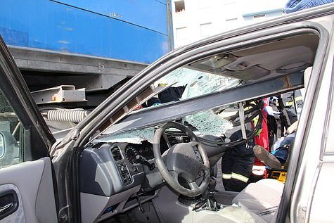 Zu einem folgenschweren Unfall kam es am Vormittag des 27.04.2018 auf einer öffentlichen Betriebszufahrt im Brunner Industriegebiet. Aus ungeklärter Ursache fuhr ein PKW-Lenker in einen dort abgestellten LKW-Anhänger. Durch die Wucht des Aufpralls bohrte sich die Anhängerdeichsel in den Fahrgastraum des grauen Nissan bis auf Höhe der Rückbank und verfehlte den Fahrer nur knapp.
