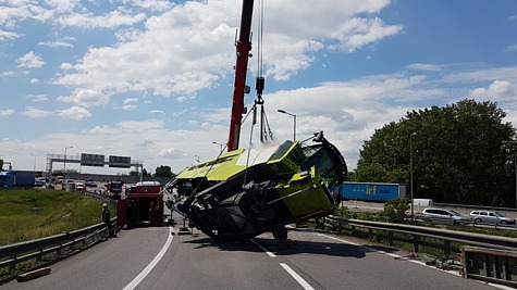 Ein auf einem Sattelauflieger befestigter Mähdrescher rutschte in der Rechtskurve von der S1 auf die A4 vom Plateau des Aufliegers und kippte um. Das vom Schwertransporter gerutschte Fahrzeug blockierte somit alle Fahrspuren und machte einen Verkehrsfluss unmöglich.