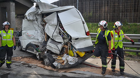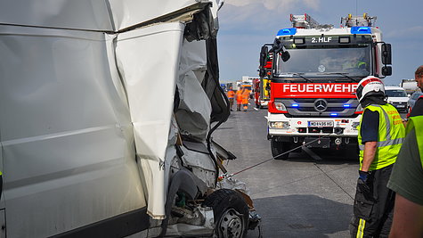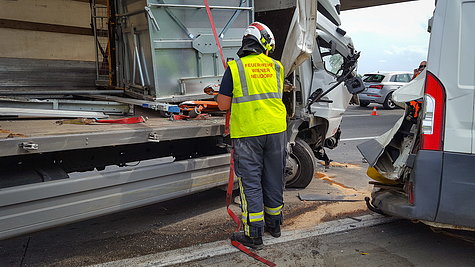 An der ersten Unfallstelle waren ein Klein-Lkw und ein Transporter zusammengestoßen, beide Fahrzeuge mussten durch die Feuerwehr von der Autobahn gebracht werden. Die Bilanz dieses Unfalls waren zwei Verletzte.