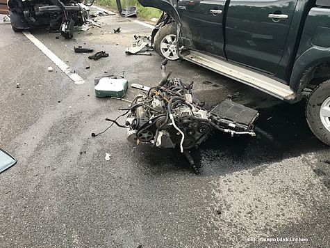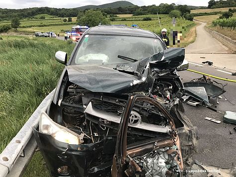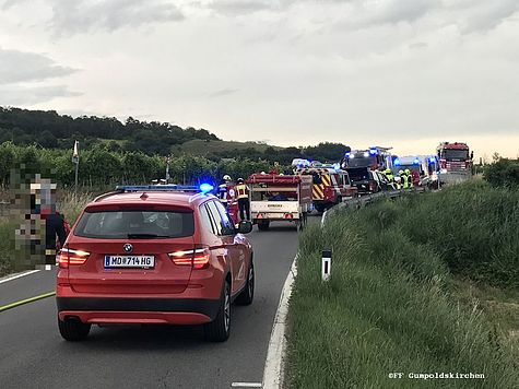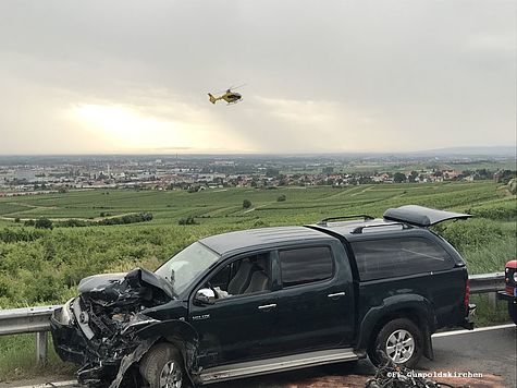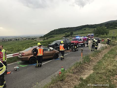 Am 12.06.2018 um 14:48 wurden die Feuerwehren Gumpoldskirchen und Guntramsdorf zu einem schweren Verkehrsunfall mit zwei Pkws, einer eingeklemmten Person und einem rauchenden Pkw auf die Weinbergstraße alarmiert.