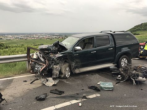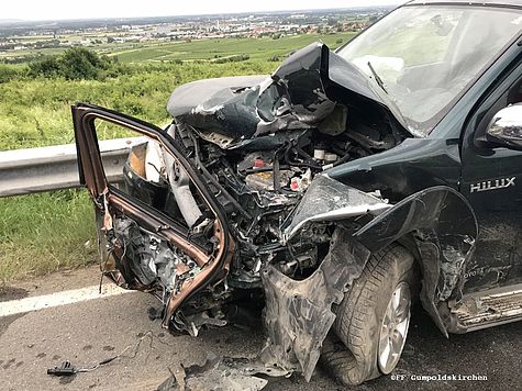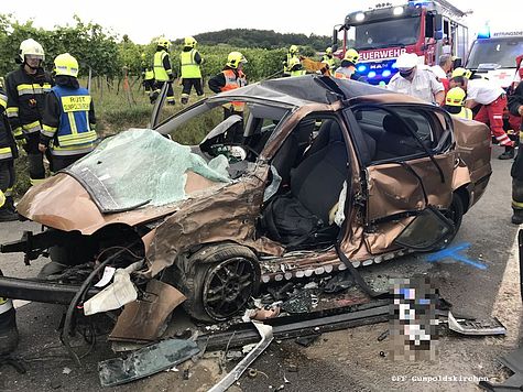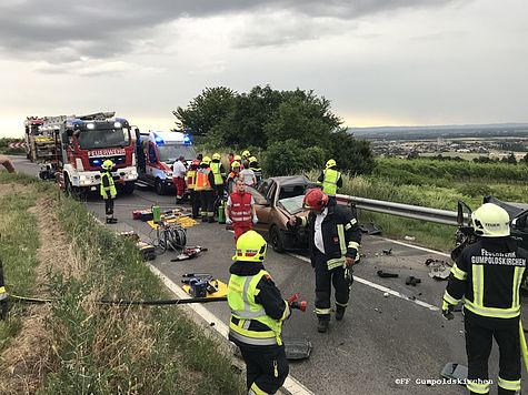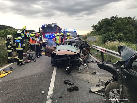 Wenige Minuten nach der Alarmierung rückten bereits die ersten Fahrzeuge beider Wehren zu der Einsatzstelle aus. Der Lenker eines Pkws verlor in einer Rechtskurve die Herrschaft über sein Fahrzeug und krachte mit der linken Seite voraus frontal gegen ein entgegenkommendes Fahrzeug. Beim Eintreffen der beiden Feuerwehren am Einsatzort wurde eine verletze Person bereits vom anwesenden Rettungsdienst betreut, eine weitere Person war noch schwer verletzt im Fahrzeug eingeklemmt. Sofort nach dem Eintreffen wurde mit der Menschenrettung (Crashrettung) begonnen und ein Brandschutz aufgebaut. Die FF Gumpoldskirchen zog die beiden stark ineinander verkeilten Fahrzeuge mit Hilfe des Vorausrüstfahrzeuges auseinander, die FF Guntramsdorf öffnete mit Hilfe eines Kombispreizers eine verklemmte Türe und schaffte somit Zugang zu dem eingeklemmten Fahrer. Im Anschluss konnte der Fahrer befreit und dem Rettungsdienst übergeben werden. Nach der Stabilisierung des Fahrers durch die Rettungskräfte wurde dieser mit dem Rettungshubschrauber Christophorus 9 in ein Krankenhaus geflogen. Die Beifahrerin wurde mit dem RTW ins Krankenhaus gebracht, weitere Personen wurden durch den Rettungsdienst und die Feuerwehr an der Unfallstelle betreut. Die beiden schwer beschädigten Fahrzeuge wurden durch das LAST Guntramsdorf und das nachalarmierte Wechselladefahrzeug der FF Wiener Neudorf zum Bauhof Gumpoldskirchen gebracht.
