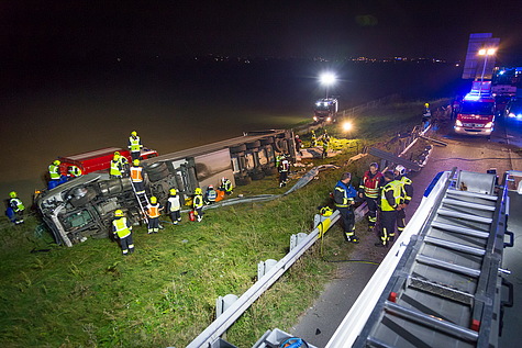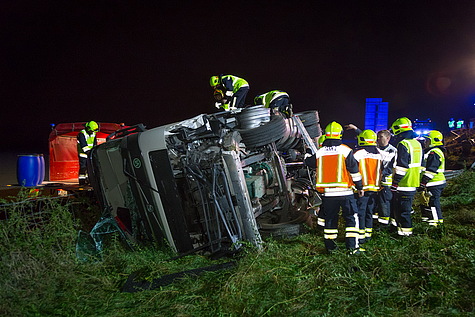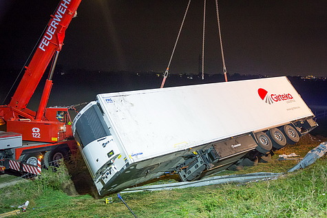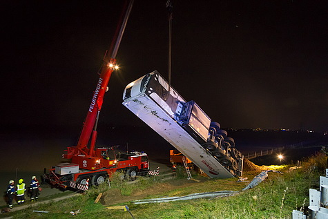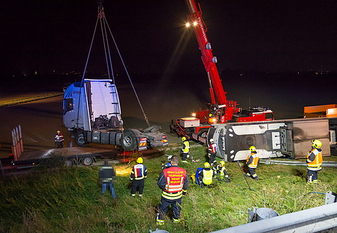 Aus unbekannter Ursache war ein Sattelschlepper von der Fahrbahn abgekommen, hatte die Leitschiene durchbrochen und war über die Böschung gestürzt. Das Fahrzeug blieb stark beschädigt auf der Seite liegen.