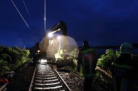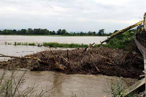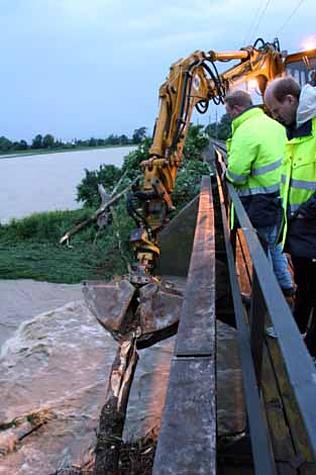 Mit einem Schienengreifer der Bahn wurde zunächst versucht, die Verklausung zu beseitigen. Ein aussichtsloses Unterfangen für das viel zu leistungsschwache Gerät. Am Mittelpfeiler der Brücke hatten sich Treibholz und mächtige Bäume fast zweieinhalb Meter hoch aufgetürmt.