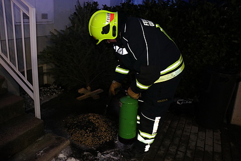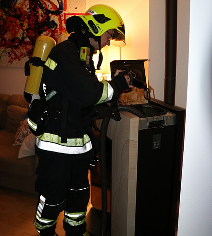 Mittels tragbaren Handfeuerlöschern konnten die Flammen rasch gelöscht werden und die Umgebung mittels Wärmebildkamera auf versteckte Glutnester kontrolliert. Hier zeigte sich, dass der Brand sehr früh erkannt wurde und es zu keiner Brandausbreitung in der Umgebung kam. Im Anschluss saugten wir die Kammer mit einem speziellen Aschesauger aus und konnten nach einer Stunde ins Feuerwehrhaus einrücken.