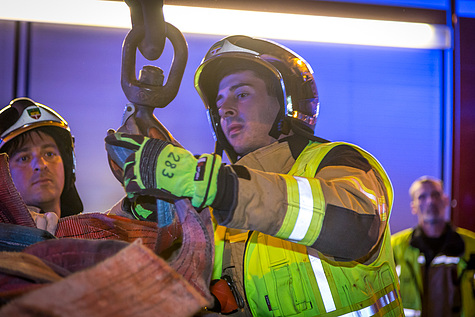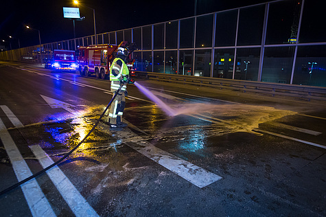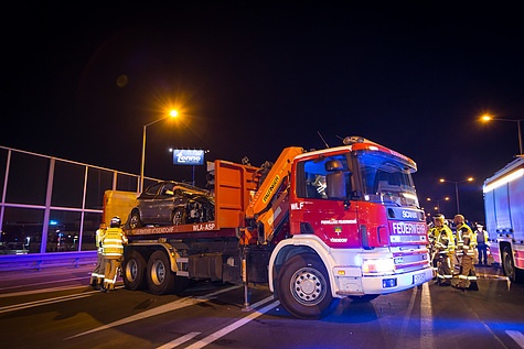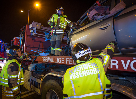 Die FF Vösendorf barg den verunfallten Pkw mit dem Wechselladefahrzeug und reinigte die Fahrbahn – 26 Mann waren mit vier Fahrzeugen im Einsatz.