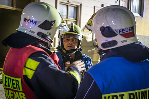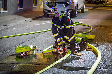 Minuten nach der Alarmierung trafen bereits zwei Tanklöschfahrzeuge der Feuerwehr Laxenburg an der Einsatzadresse ein. Der Einsatzleiter wurde vor dem Gebäude bereits von mehreren Passanten erwartet und erkundete die Lage.