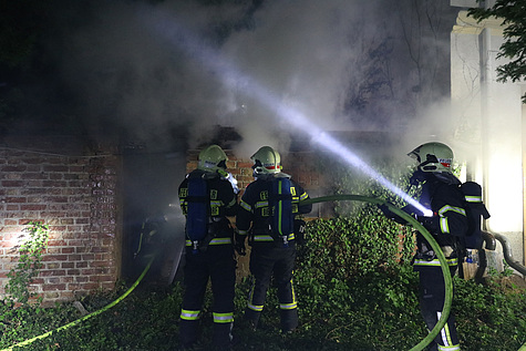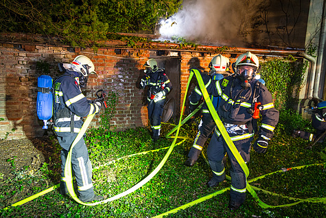 Ein Atemschutztrupp begab sich mittels Löschleitung und Steckleiter zu den ersten Löschmaßnahmen und schütze so die angrenzenden Häuser.