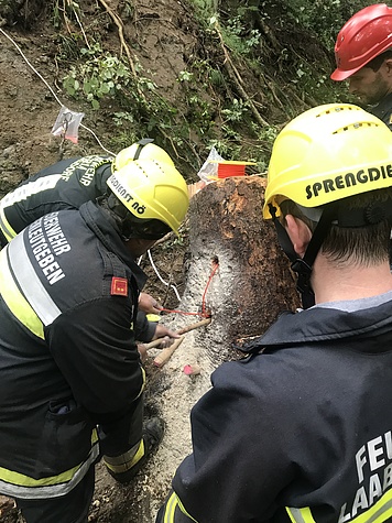 Mit vereinten Kräften konnten zwei Wurzelstöcke mittels Bohrladungen und dem Einsatz von 4,5 kg Sprengstoff und vier elektrischen Sprengzündern erfolgreich zerteilt werden und das volle Abflussprofil des Wildbaches wiederhergestellt werden.