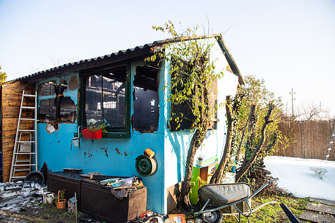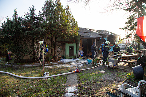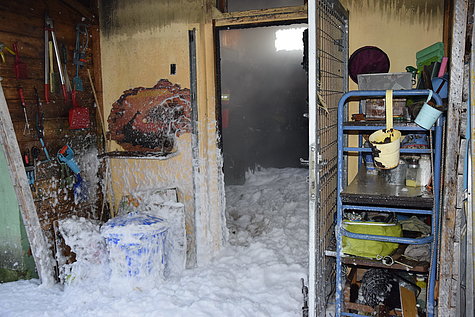 Beim Eintreffen des erstausrückenden Fahrzeuges, Tank 2, stand eine größere Schrebergartenhütte in Vollbrand. In der Anfangsphase kam es zu mehreren Explosionen durch berstende Spraydosen und Druckbehälter. Umgehend wurde ein Außenangriff mit zwei C-Strahlrohren gestartet. Ein Innenangriff war zu diesem Zeitpunkt nicht mehr möglich, da Teile des Gebäudes bereits einstürzten. Vom zweiteintreffenden Fahrzeug, Tank 3, wurde eine weitere Lösch-Leitung in den benachbarten Schrebergarten gelegt, um die dort befindliche Hütte vor einem Übergreifen der Flammen zu schützen.
