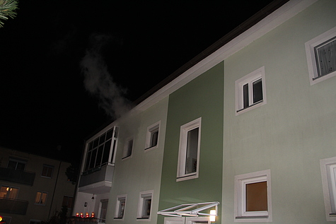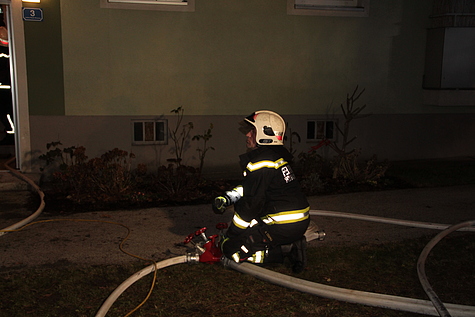 Zu diesem Zeitpunkt war bereits Feuerschein aus der Wohnung zu erkennen und, da die Eingangstüre der Brandwohnung nicht vollständig geschlossen war, das angrenzende Stiegenhaus bereits stark verraucht. Daher machte sich ein bereits auf der Anfahrt ausgerüsteter Atemschutztrupp mit einer C-Leitung und unter Zuhilfenahme einer Wärmebildkamera auf die Suche nach dem Brandherd, welcher trotz der massiven Verrauchung wenig später in der Küche der Wohnung im ersten Obergeschoß ausgemacht und mit den Löscharbeiten begonnen werden konnte. Zwischenzeitlich wurde eine Abluftöffnung geschaffen, um das Stiegenhaus sowie die Brandwohnung mittels von der Tank 2-Mannschaft in Stellung gebrachten Druckbelüfters rauchfrei zu bekommen.