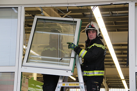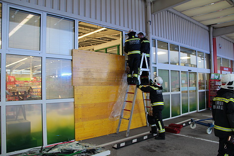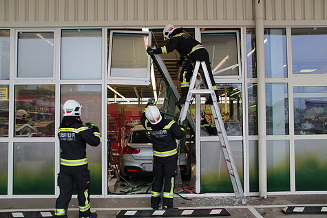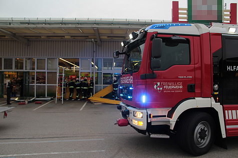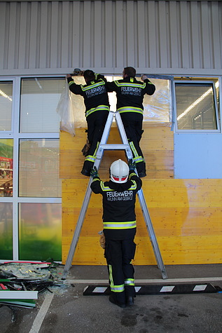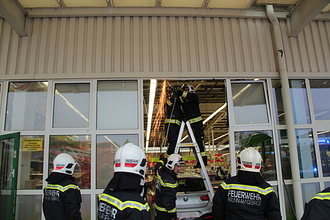 Nach der Unfallaufnahme durch die Exekutive und die präventive Untersuchung der Unfalllenkerin durch das Rote Kreuz Brunn am Gebirge wurde die Freiwillige Feuerwehr Brunn am Gebirge um 14:26 Uhr zur Fahrzeugbergung alarmiert. Ausgerüstet mit reichlich Pölz- und Schalmaterial trafen wenig später zwei vollbesetzte Einsatzfahrzeuge an der Unfallstelle ein. Unmittelbar nach der Freigabe durch die Exekutive wurden zuerst die losen Teile der Fassade gesichert bevor der nur leicht beschädigte Unfall-BMW aus dem Geschäftslokal gefahren werden konnte. Anschließend konnte die Wand mit Schaltafeln und PVC-Folie provisorisch verschlossen werden.