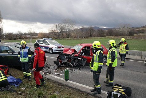 Kurz nach der Alarmierung rückten sechs Fahrzeuge zur Einsatzstelle aus. Dort angekommen, fanden die Kräfte ein wahres Schlachtfeld vor. Zwei Pkw's sind aus noch unbekannter Ursache frontal zusammen gestoßen. Alle Insassen, unter ihnen auch mehrere Kleinkinder, konnten sich selbst aus den völlig zerstörten Wracks befreien bzw. wurden von nachkommenden Lenkern befreit und lagen beim Eintreffen im Grünstreifen. Insgesamt sechs zum Teil schwer Verletzte waren zu versorgen.