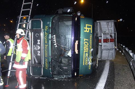 Der Fahrer wurde nur leicht verletzt, konnte das Führerhaus aber nicht aus eigener Kraft verlassen. Er wurde von der Feuerwehr Wiener Neudorf mit Hilfe einer Leiter aus dem Führerhaus befreit. Zur Bergung des umgestürzten Fahrzeuges wurde die Feuerwehr Mödling mit dem schweren Kran alarmiert. Dieser kehrte gerade von einem anderen Bergungseinsatz im Bereich Hochstrass zurück und fuhr die Unfallstelle direkt an. Nach dreistündigem Einsatz, der durch strömenden Regen erschwert wurde, konnten die Bergungsarbeiten der Feuerwehren Wiener Neudorf und Mödling schließlich abgeschossen werden. Zunächst hatte die mit Getreide beladene Mulde des Sattelschleppers mit Schaufeln von mehreren Kubikmetern Ladegut befreit werden müssen. Ausfließenden Dieseltreibstoff konnte die Feuerwehr Wiener Neudorf, die auch mit einem Schadstofffahrzeug im Einsatz war, binden bzw. abpumpen. Mit dem Kranfahrzeug der Feuerwehr Mödling wurde der umgestürzte Sattelzug dann wieder auf die Räder gestellt. Anschließend wurde das Unfallfahrzeug vom Kran zu einem Abstellplatz geschleppt. Die Autobahnmeisterei übernahm die weiteren Aufräumungsarbeiten an der Unfallstelle.Bildautor: Gottfried Bauer / Pressestelle BFK Mödling