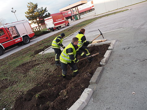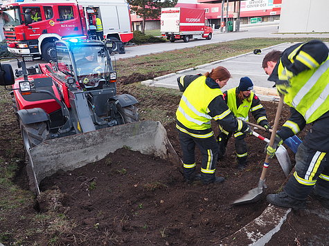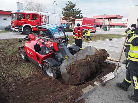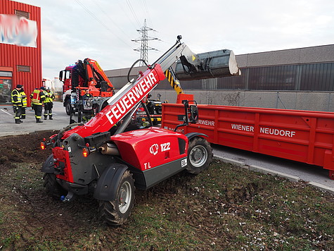 Im Industriezentrum angekommen, wurde durch den Einsatzleiter OBM Andreas TATAI ein PKW in Graben wahrgenommen sowie eine massive Kontaminierung von Erdreich durch Kraftstoff festgestellt. Vorerst wurde der verunfallte PKW aus dem Graben gezogen und nach Rücksprache mit diversen Stellen wurde entschieden, dass Erdreich auszuheben und ordnungsgemäß zu entsorgen. Auf Grund dessen wurde die interne Alarmstufe erhöht und der erweiterte technische Zug wurde gängig gemacht. Das „Last“ und der „Teleskoplader“ fuhren nun die Einsatzörtlichkeit an. Zeitgleich fuhr der Kommandant OBI Bernhard TRÖSZTER die Schadensstelle an um sich einen Überblick zu schaffen und die Einsatzleitung zu übernehmen. Überdies wurde das „Wechselladefahrzeug“ der Freiwillige Feuerwehr Wiener Neudorf an die Einsatzörtlichkeit beordert um das Erdreich zu verladen.
