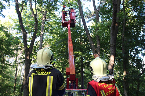 Aufmerksame Spaziergänger bemerkten im Waldgebiet am Liechtenstein ein eigenartiges Knarren der Bäume und verständigten daraufhin die Feuerwehr. Am 23. Juni 2020 um 16:55 Uhr rückten daraufhin die Mitglieder der Freiwilligen Feuerwehr Maria Enzersdorf zu einem Sturmschaden aus. Schnell stellte sich heraus, dass einer der Bäume einen großen Riss hatte und dadurch ein Teil der Baumkrone abzubrechen drohte. Mittels Motorkettensäge wurden zunächst drei kleinere Bäume entfernt, um das Aufstellen des Hubrettungsfahrzeuges zu ermöglichen. Anschließend mussten die Einsatzkräfte höher gelegene Äste entfernen, die die weiteren Arbeiten behinderten. Da es den Einsatzkräften aufgrund der Höhe der schadhaften Stelle nicht möglich war, die Äste sicher abzuschneiden wurde die Seilwinde des schweren Rüstfahrzeuges befestigt und der betroffene Teil der Baumkrone damit zu Fall gebracht. Anschließend entfernte die Mannschaft des Hubrettungsfahrzeuges die verbliebenen losen Äste. Nach knapp zweieinhalb Stunden waren die neun Mitglieder mit ihren vier Fahrzeugen wieder in das Feuerwehrhaus eingerückt.
