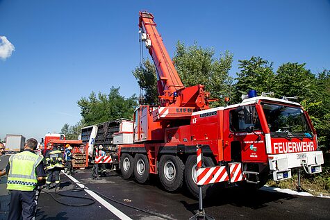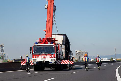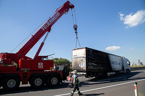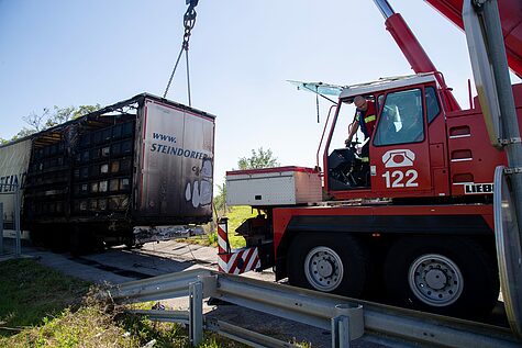 Zur raschen Bergung des Anhängers wurde entschieden die Zugmaschine wieder an den bereits gelöschten Auflieger zu kuppeln. Aufgrund des erheblichen Brandschadens an den Reifen war eine Weiterfahrt bis zu einer gesicherten Abstellmöglichkeit nicht möglich. Darum wurde der Anhänger durch Kran Mödling im hinteren Teil angehoben und die Last dann im aufgestellten Zustand des Krans bis zur nächsten Betriebsausfahrt verfahren. Eine enge Zusammenarbeit mit dem LKW- Fahrer und der Kranmannschaft war hier unerlässlich.