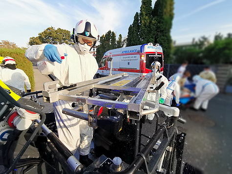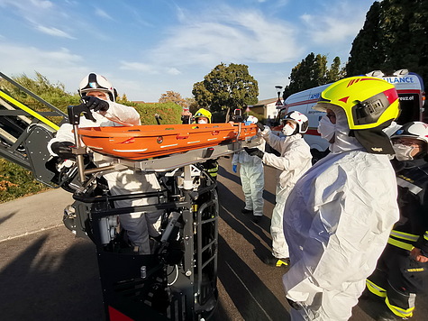 Bei der Alarmierung der Feuerwehr wurde bekanntgegeben, dass es sich um einen covid-19-positiven Patienten handelt, daher mussten zusätzliche Sicherheitsvorkehrungen getroffen werden: Ein Teil der Feuerwehrmannschaft rüstete sich darum mit Einwegschutzanzügen und FFP3-Atemschutzmasken aus. Dieser Teil der Feuerwehrleute übernahm die Arbeiten in direkter Nähe sowie die Reinigungsarbeiten nach der Übergabe des Patienten an den Rettungsdienst.
