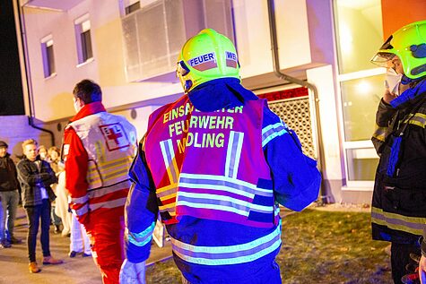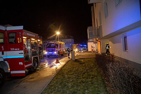 Beim Eintreffen vor Ort standen Personen auf ihren Balkonen oder kamen den Einsatzkräften durch das de facto nicht verrauchte Stiegenhaus entgegen. Während die Brandbekämpfung mittels einer C- Löschleitung unter Zuhilfenahme eines Rauchvorhangs eingeleitet wurde, startete die Räumung des Wohnhauses. Dabei wurden ca. 10 Personen durch die Feuerwehr aus dem Wohnhaus ins Freie gebracht.