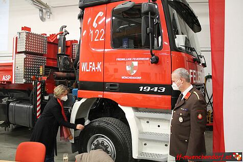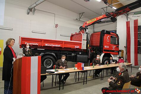 Im Anschluss an die Berichterstattung wurde das kürzlich erworbene und generalüberholte neue Wechselladerfahrzeug mit Bergekran der anwesenden Mannschaft präsentiert. Wegen der Corona-Pandemie und des damit verbundenen Veranstaltungsverbots entschied sich das Kommando dazu, das Fahrzeug im Zuge der Jahreshauptversammlung in den Dienst zu stellen und verzichtete demnach auf einen großen Festakt. Als Ehrengäste durften wir jedoch Bürgermeister Josef Ehrenberger, Vizebürgermeisterin Helga Reisenauer sowie die designierte Fahrzeug-Namenspatin und Frau des amtierenden Kommandant-Stellvertreters, Stella Bokor, für den offiziellen Teil der Indienststellung des so genannten WLFA-K (Wechselladerfahrzeug Allrad mit Kran) begrüßen.