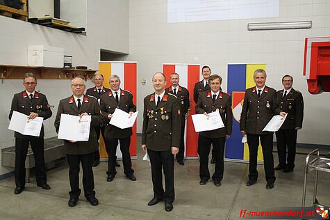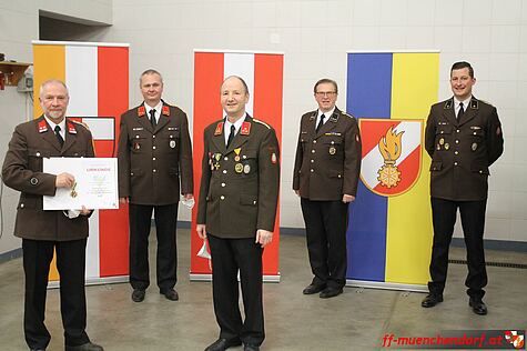 Zum Abschluss der Beförderungen wurde dem ehemaligen Feuerwehrkommandant der Feuerwehr Münchendorf, Hauptbrandinspektor Andreas Polacsek, der Ehrendienstgrad für seine langjährige Tätigkeit im Kommando der Feuerwehr Münchendorf verliehen.