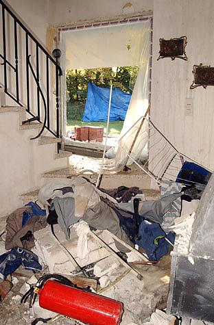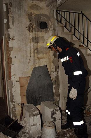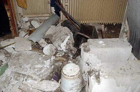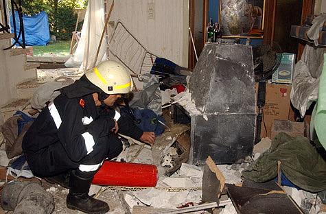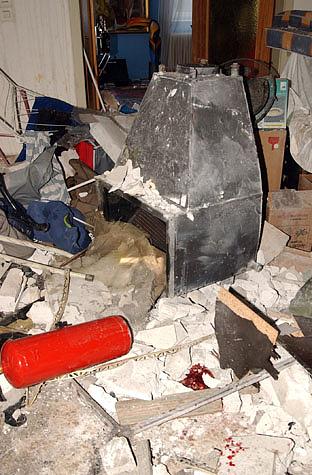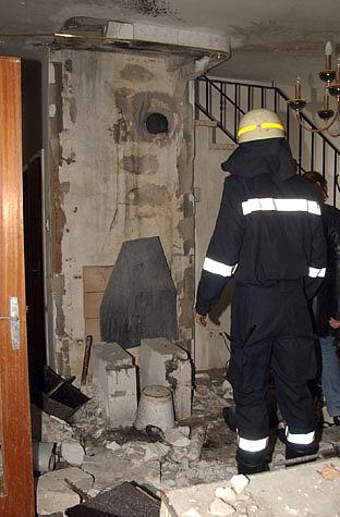 Am Einsatzort, ein Einfamilienhaus in einer Nebengasse, fand die Feuerwehr eine Situation vor, die an die Explosion einer Bombe erinnerte. Der Stahleinsatz des Ofens war von der Wand weggerissen worden, die Ummauerung aus Ytong-Steinen war in ihre Bestandteile aufgelöst. Der Fußboden war mir Mauerbrocken übersät.