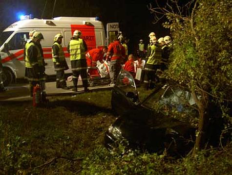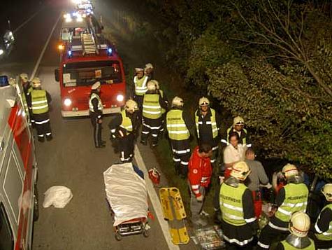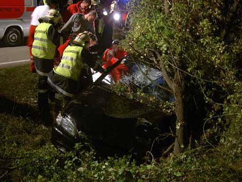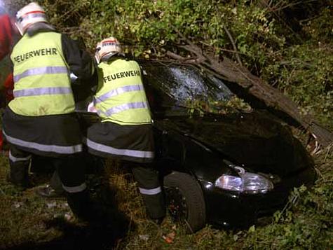 Kurz darauf rückten vier Fahrzeuge mit 20 Mitgliedern zum Einsatz aus. Beim Eintreffen am Unfallort lag der Beifahrer neben dem Fahrzeug mit den Beinen im Fußraum der Beifahrerseite. Der Fahrer hatte sich selbst befreien können. Bis zum Eintreffen des Rettungsdienstes wurden die Verletzten von der Feuerwehr versorgt. Lenker und Beifahrer wurden mit Verletzungen unbestimmten Graden mit dem RTW Alland und NAW Baden ins Krankenhaus gebracht. Die weiteren Tätigkeiten der Feuerwehr Gaaden waren das Beleuchten der Unfallstelle, Bergen des PKW und die Reinigung der Strasse. Nach eineinhalb Stunden war der nächtliche Einsatz beendet, die Helfer konnten wieder ins Feuerwehrhaus einrücken.Bildautor: Freiwillige Feuerwehr Gaaden