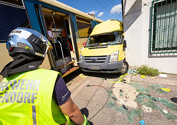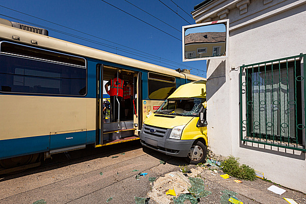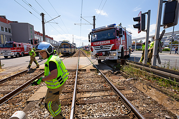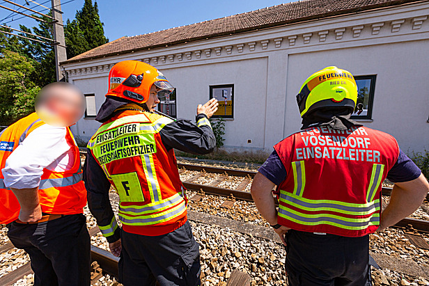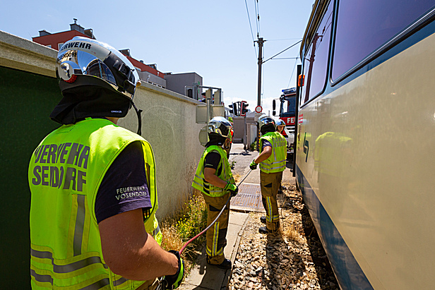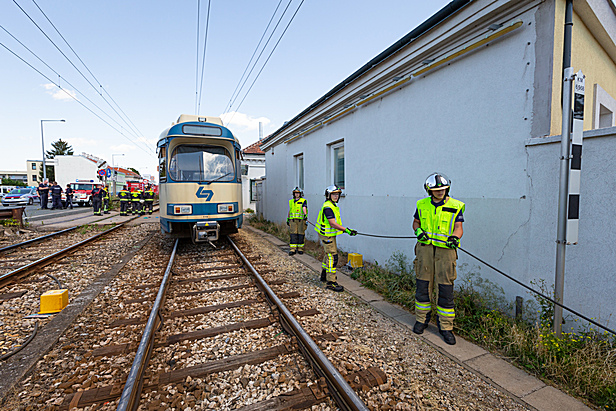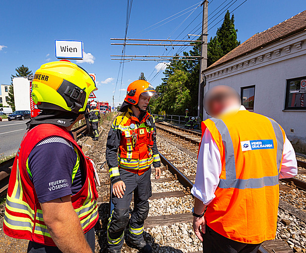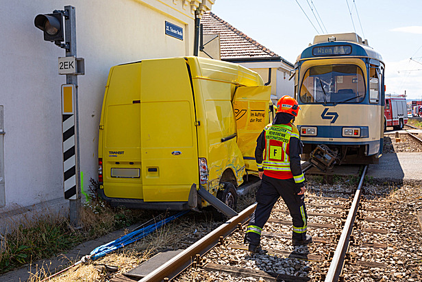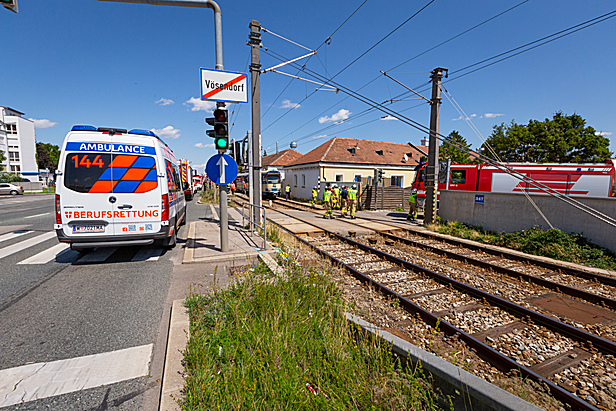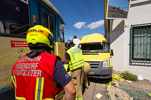 Um kurz nach 12 Uhr wurde die Freiwillige Feuerwehr Vösendorf zum Verkehrsunfall alarmiert. Erst beim Eintreffen konnte durch den Einsatzleiter festgestellt werden, dass eine Person im Fahrzeug eingeklemmt ist, weswegen die Alarmstufe auf „T2 - Menschenrettung“ erhöht wurde – der Kleintransporter steckte zwischen der Zuggarnitur und einer Hausmauer. Auch die Berufsfeuerwehr Wien begab sich mit einem Großaufgebot an Einsatzkräften zum Einsatzort.