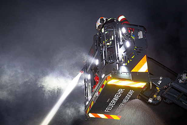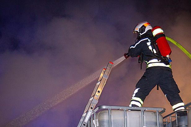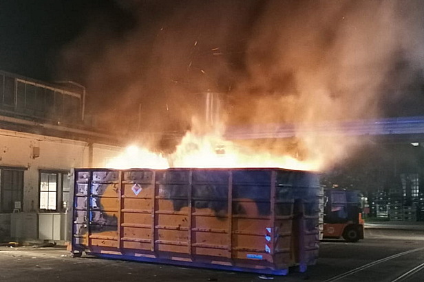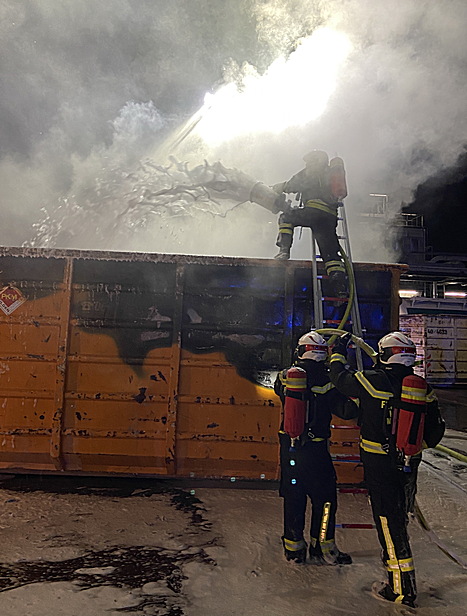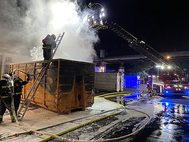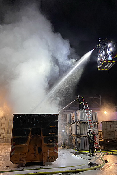Der erste Löschangriff mit Wasser zeigte nur bedingt Wirkung, deshalb entschied der Einsatzleiter, den Container mit Schaum zu fluten. Erst nach massivem Schaum- und Wassereinsatz, unter anderem über die Drehleiter, konnte nach rund 90 Minuten "Brand aus" gemeldet werden. Die angrenzende Werkshalle wurde durch die Feuerwehr kontrolliert, wobei keine Gefährdung durch den Brand festgestellt werden konnte.