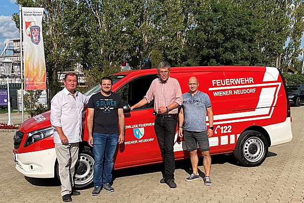 Nach Ankunft des Fahrzeuges mit grünem Kennzeichen am 2. September 2021 gratulierten Landtagsabgeordneter Martin Schuster und Wiener Neudorfs Bürgermeister Herbert Janschka dem Feuerwehrkommandant Branddirektor Walter Wistermayer zum Zuwachs im Fuhrpark.