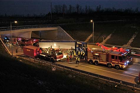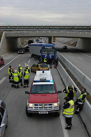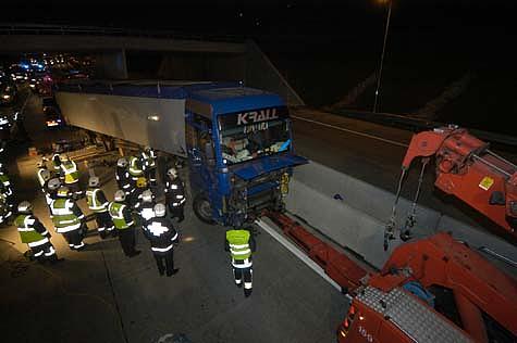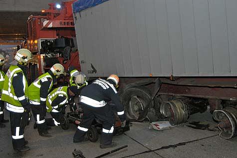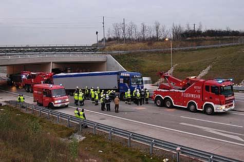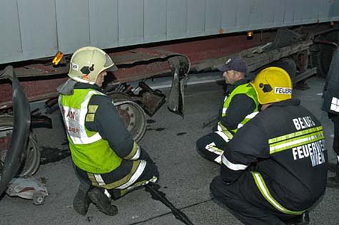 Kurz nach 15 Uhr war ein mit Getreide beladener Sattelschlepper zwischen den Ausfahrten Rothneusiedl und Laxenburgerstraße rechts von der Fahrbahn abgekommen und hatte die Betonleitwand touchiert. Der Lkw-Zug kollidierte in der Folge noch mit einem Pkw, der umstürzte und am Dach liegen blieb. Pkw- und Lkw-Lenker blieben nach ersten Informationen unverletzt, ein im Pkw mitfahrender Hund wurde unbestimmten Grades verletzt und musste ins Tierschutzhaus zur Notversorgung gebracht werden. Bei dem Crash wurden sämtliche Achsen des Sattelschleppers beschädigt, der fahrunfähig gewordene Transporter blockierte die Autobahn. In der Folge rückten die Freiwillige Feuerwehr Vösendorf mit vier Fahrzeugen sowie Freiwillige Feuerwehr Mödling mit dem schweren Kranfahrzeug auf die S1 aus. Ebenso wurde die Berufsfeuerwehr Wien verständigt, die unter anderem mit dem Lkw-Abschleppfahrzeug und einem Werkstättenfahrzeug an der Unfallstelle eintraf. Nachdem sich die Unfallstelle auf Einsatzgebiet der Berufsfeuerwehr befand, leitete diese die Bergungsarbeiten, die Freiwilligen Feuerwehren leisteten Assistenz. Aufgrund der Beladung des Schwerfahrzeuges und der kaputten Achsen gestaltete sich die Bergung äußerst schwierig. Mit vereinten Kräften gelang es kurz vor 19 Uhr, den Aufleger und das Zugfahrzeug abzuschleppen.Bildautor: Martin Hofbauer/Pressestelle BFK Mödling