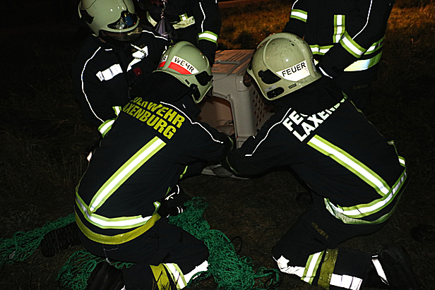 Mit einem Fangnetz wurde der Schwan behutsam eingefangen und vorsichtig in eine Tierrettungsbox verfrachtet.