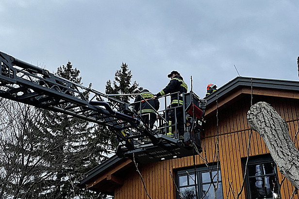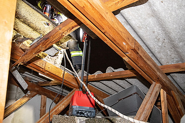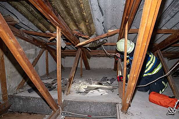 Durch die Feuerwehr wurden umgehend weitere absturzgefährdete Teile am Dach und am Dachboden gesichert. Zusätzlich wurde durch die Einsatzleitung Pölzmaterial zum Einsatzort nachgefordert. Damit wurde die Stiege behelfsmäßig so repariert, dass die im ersten Stock befindlichen Personen, darunter ein Kind, das Gebäude verlassen konnten. In weiterer Folge wurde das Dach mittels Planen verschlossen um einen Wassereintritt zu verhindern. Während des gesamten Einsatzes wurden die im Haus befindlichen Bewohner durch einen Feuerwehrmann betreut. Nach über zweieinhalb Stunden konnte auch dieser Einsatz mit fünf Fahrzeugen und 15 Einsatzkräften beendet werden.