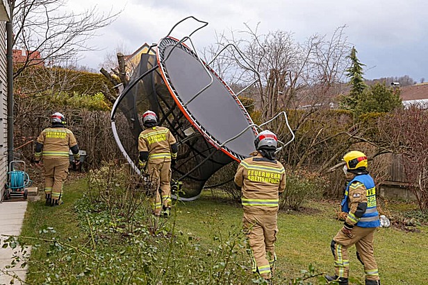 Die Bewohner eines Einfamilienhauses in der Merz Gasse stellten fest, dass plötzlich ein Trampolin in ihrem Garten lag. Schnell konnte festgestellt werden, dass das Trampolin aus dem Nachbarsgarten über den Gartenzaun geweht wurde. Kurzerhand wurde das stark verbogene Trampolin in kleinere Teile zerlegt und in den Garten des Besitzers gehoben. Durch Steinfliesen wurde das Trampolin beschwert und gegen Abheben gesichert.