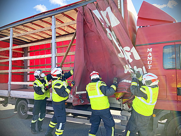 Die zur Bergung alarmierte Freiwillige Feuerwehr Wiener Neudorf rückte mit drei Fahrzeugen auf die Autobahn aus. Unverzüglich wurde nach Ankunft der Einsatzkräfte wurde das mit der Hinterachse in der Luft schwebende Zugfahrzeug mit einer Seilwinde gegen Umfallen gesichert. Gemeinsam mit dem umgestürzten Anhänger blockierte der Lkw alle vier Fahrspuren und sorgte für eine Totalsperre der Südautobahn.