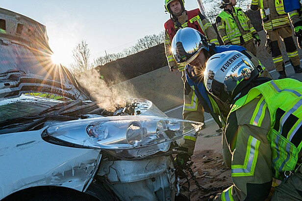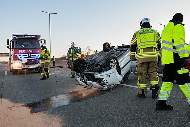 Nach Freigabe der Einsatzstelle durch die Autobahnpolizei wurde das Unfallfahrzeug mit Muskelkraft wieder auf die Räder gestellt, von der Autobahn entfernt und gesichert abgestellt.