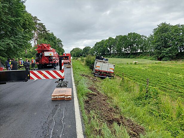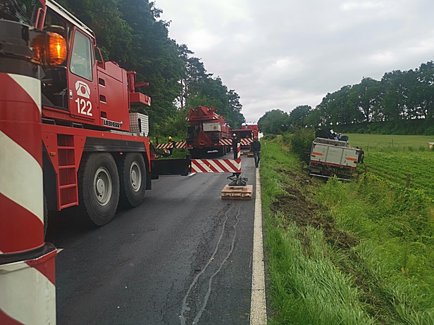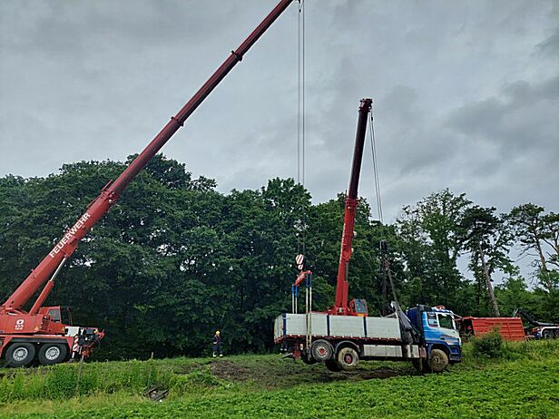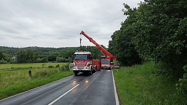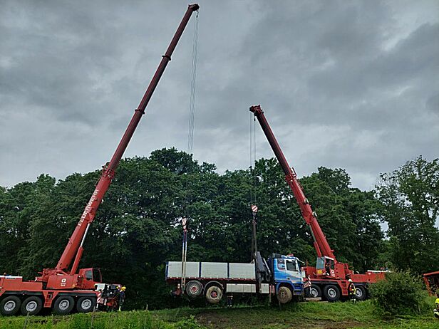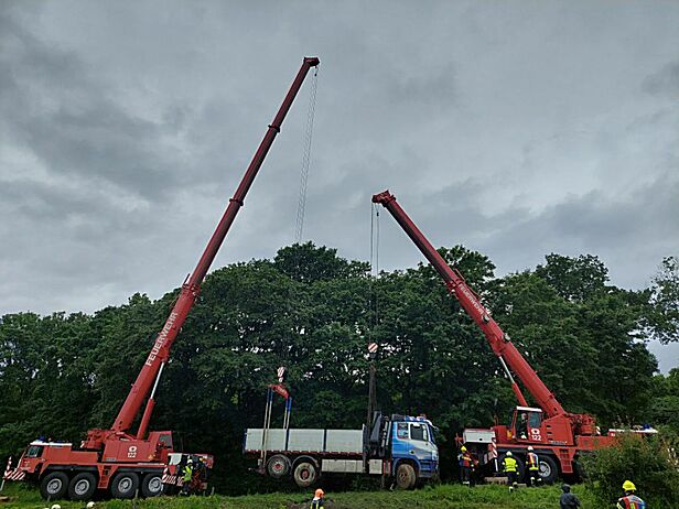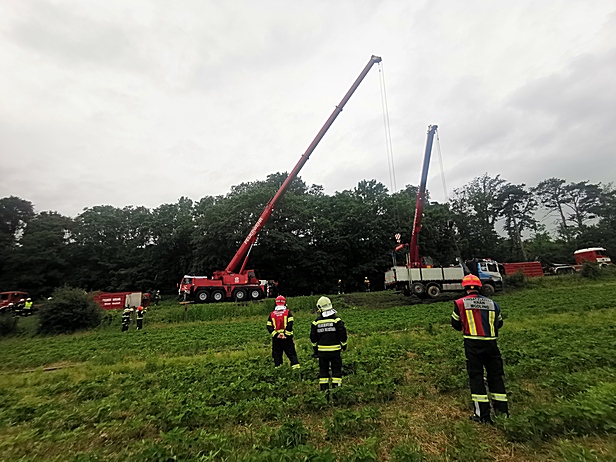 Zwei Feuerwehr Kräne bei LKW-Bergung in Wiesen im Einsatz