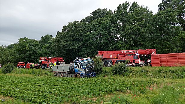 Im Zuge eines Verkehrsunfalles kam ein 18-Tonnen-LKW von der Fahrbahn ab und landete in einem angrenzenden Erdbeerfeld. Die örtlich zuständige Feuerwehr forderte daraufhin das in der Nähe stationierte schwere Kranfahrzeug der Feuerwehr Wiener Neustadt zur Bergung an.
