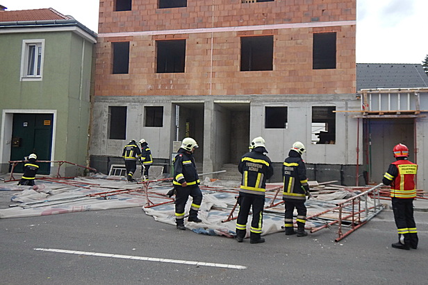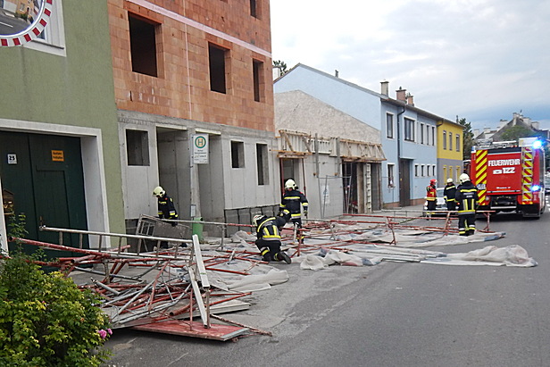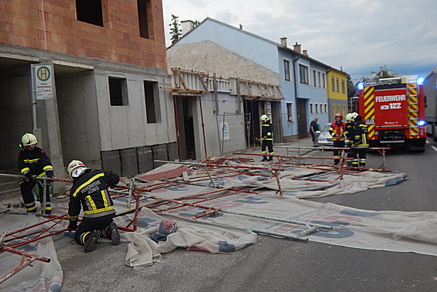 Am Freitag den 01. Juli 2022 wurde die Freiwillige Feuerwehr Achau am Abend zu einem umgestürzten Baugerüst auf der Hauptstraße alarmiert. Starke Windböen hatten das Baugerüst aus den Verankerungen gerissen. Zum Glück kamen keine anderen Verkehrsteilnehmer oder Personen dabei zu Schaden. Das Baugerüst lag über die ganze Breite der Hauptstraße B11und hat diese vollständig blockiert.
