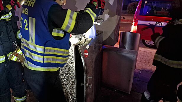 Aus unbekannter Ursache war eine Person in eine leere Paketbox der Post eingestiegen und hatte die Türe verschlossen. Ein Öffnen der Paketbox war durch die eingesperrte Person und deren Freunde weder von innen noch von außen möglich.