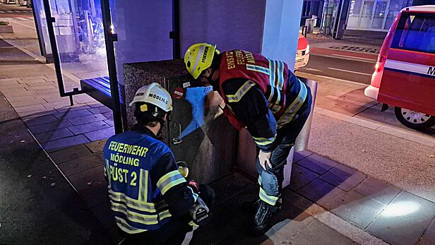 Aus diesem Grund wurde gegen 04:10 ein Notruf an die Feuerwehr abgesetzt. Die rasch eingetroffene Feuerwehr Mödling stellte vorerst Sprechkontakt zur Person her. Anschließend konnte die Paketbox mit dem akkubetriebenen Türöffnungsgerät und einem Halligantool (dabei handelt es sich um ein Hebel- und Brechwerkzeug) gewaltsam geöffnet werden.