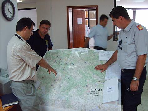 Ein Hilferuf der mazedonischen Behörden blieb beim NÖ Landesfeuerwehrverband nicht ungehört. Rasch entschloss man sich zwei Experten aus NÖ zur Unterstützung und Beratung des örtlichen Krisenzentrums in Skopje zu entsenden. Niemand geringerer als unser Bezirksfeuerwehrkommandant Stellv. BR Ing. Richard Feischl, Experte in der Stabsarbeit, sowie OBR Ing. Albert Brix, Kommandant des NÖ Feuerwehrflugdienstes, stehen neben anderen Hilfskräften aus Kroatien, Slowenien, Schweden und der Türkei in Mazedonien den überlasteten Einsatzkräften mit Ihren Erfahrungen zur Seite.Bildautor: Niederösterreichischer Landesfeuerwehrverband