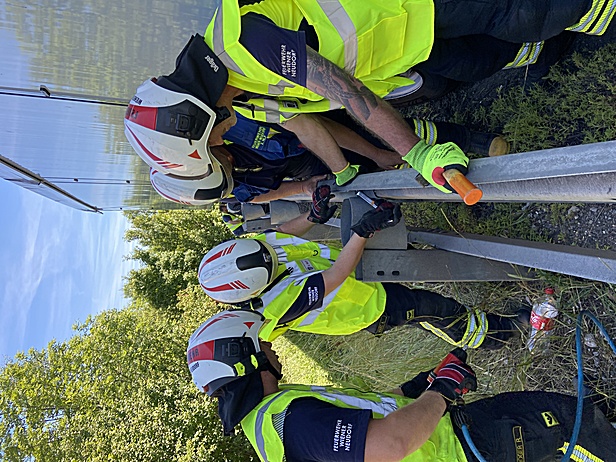 Durch die Feuerwehr Wiener Neudorf wurden gleich nach Eintreffen mittels Auffangwanne austretende Betriebsstoffe aufgefangen. In weiterer Folge mussten 400 Liter Diesel aus dem LKW Tank in Fässer umgepumpt werden. Anschließend musste vor der Bergung die Leitschiene entfernt werden. Dabei kamen unter anderem eine Säbelsäge und ein Winkelschleifer zum Einsatz.