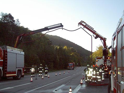 über die Bundesstrasse zur Zufahrtsstrasse auf den Steinbruch mittels zwei Ladekränen aufzubauen.