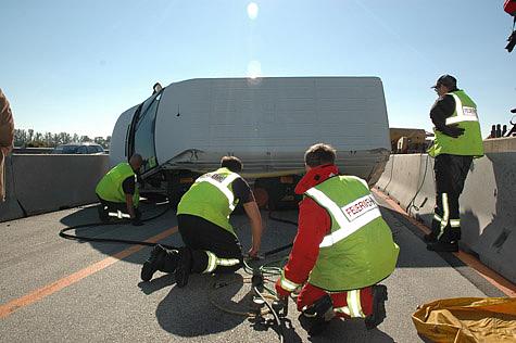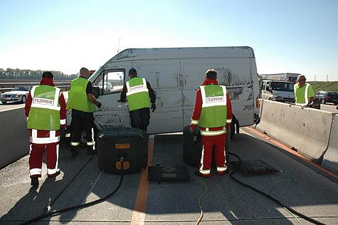 Das Aufstellen mittels Kran oder Seilwinde war aufgrund der örtlichen Begebenheiten nicht möglich, so entschied sich der Einsatzleiter für den Einsatz von Hebekissen. Zuerst wurde das Fahrzeug mit kleineren Hebekissen leicht angehoben um den Hebe- und Bergesatz des SRF unter dem Fahrzeug positionieren zu können.